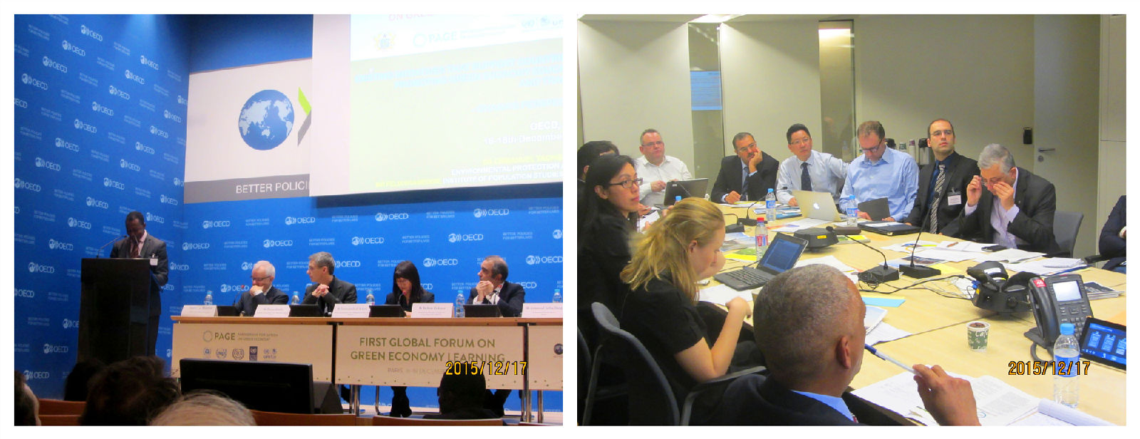 12月16日至18日,由联合国训练研究所(UNITAR)、经济合作与发展组织(OECD)、绿色经济行动伙伴关系(PAGE)、全球绿色增长组织(GGGI)、绿色增长知识平台(GGKP)和国际技术与职业教育培训中心(UNESCO-UNEVOC)共同主办的“首届绿色经济学习全球论坛”(First Global Forum on Green Economy Learning)在法国巴黎国际经济合作与发展组织总部召开。来自世界各地60多个政府部门、教育机构、非政府组织的100多名代表出席论坛。我校参与了相关组织的绿色技能和绿色课程开发与研究,作为课题主持人我校郑刚强老师应邀出席,参与研讨、交流全球绿色经济学习方法、机遇与发展目标并介绍了我校的研究成果。