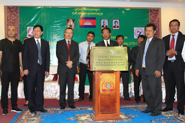 4月24日,全国首个在柬埔寨王国设立的职教中心——浙经院—柬创院国际教育中心在柬埔寨王国首都金边举行了揭牌仪式,中国驻柬埔寨王国大使馆李岸参赞及程希女士、柬埔寨王国劳工部职教培训司司长Hing Sideth先生等出席会议并分别致辞,同时对中心即将开展的各项文化交流和办学合作等项目寄予厚望。我校副校长黄春麟教授和柬埔寨王国柬印创业发展学院院长Tan Kosal先生分别发表讲话,并代表双方签署了两校合作协议,为“浙经院—柬创院国际教育中心”揭牌。揭牌仪式后,我校艺术专业教授朱红亮和对外汉语言教学教师沈祎在柬印创业发展学院为学生作为期一周的教学活动。