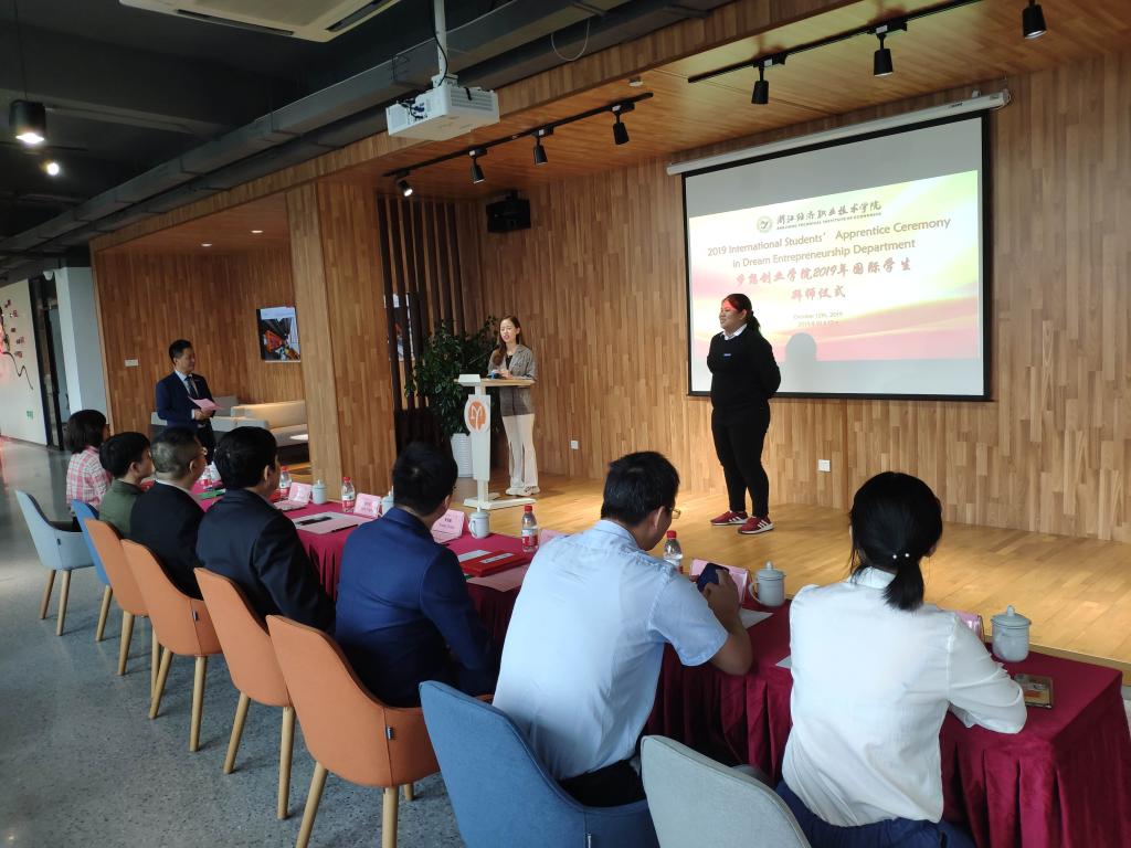 10月12日上午,2019级国际学生拜师仪式在联合国教科文组织职教联系中心国际留学生创新创业实习基地——梦想创业学院举行。党委委员、副校长黄春麟,党委委员、副校长姜宇国,杭州任真贸易有限公司平台运营总监萧方军、副总监陈五毛,梦想创业学院院长王细红,外事办(国际教育中心)主任郑刚强以及相关师生出席活动。