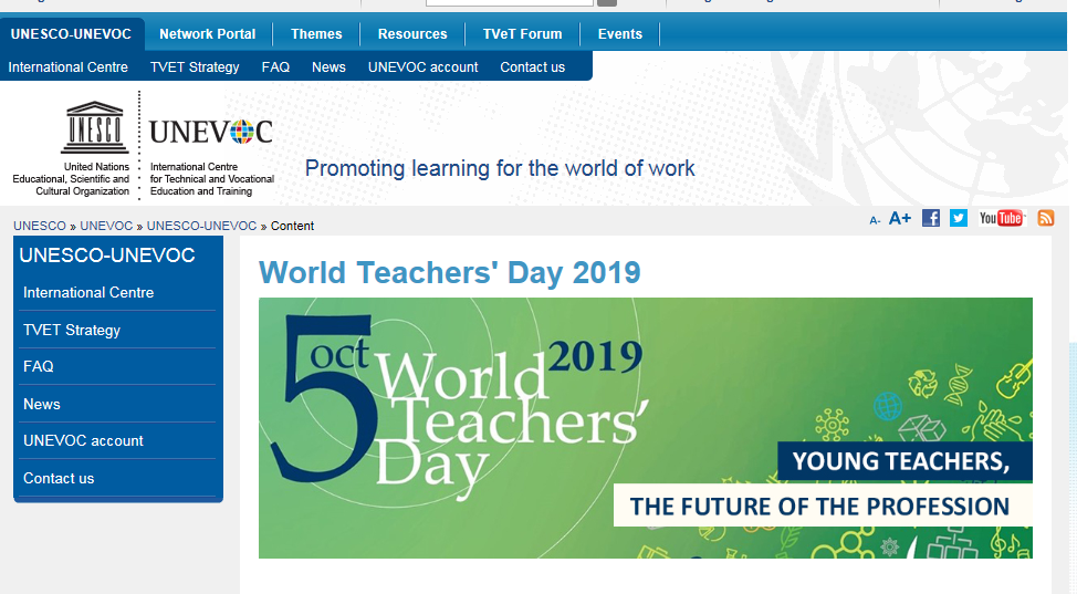 每年的10月5日为世界教师日,由联合国教科文组织和国际劳工组织于1994年共同发起。今年,世界教师日以“青年教师:职业的未来”为主题,重点关注教师为社会可持续发展方面所做出的贡献。我校青年教师刘畅的故事入选联合国教科文组织职教中心有关世界教师日的系列报道中。
