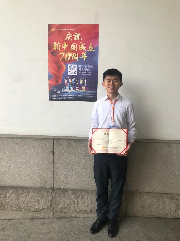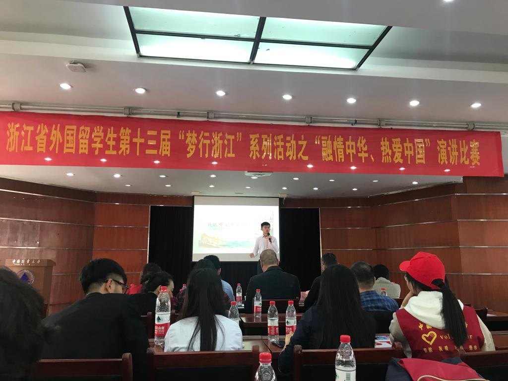 本次演讲比赛由省教育厅与省政府新闻办、省政府外办和浙江广播电视集团联合举办。演讲比赛竞争激烈,各校参赛选手围绕“庆祝新中国成立七十周年”的主题,用流利自然的汉语向大家介绍了他们眼里的中国和浙江经济社会发展等各方面的成就。麦俊旻同学以自己在中国留学一年的亲身经历为切入点,声情并茂地讲述了自己的中国故事,还表演了一套太极拳,获得了评委们和观众的掌声。
