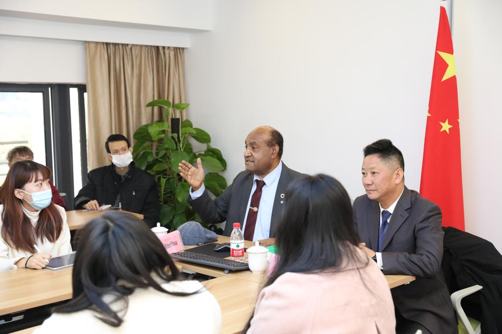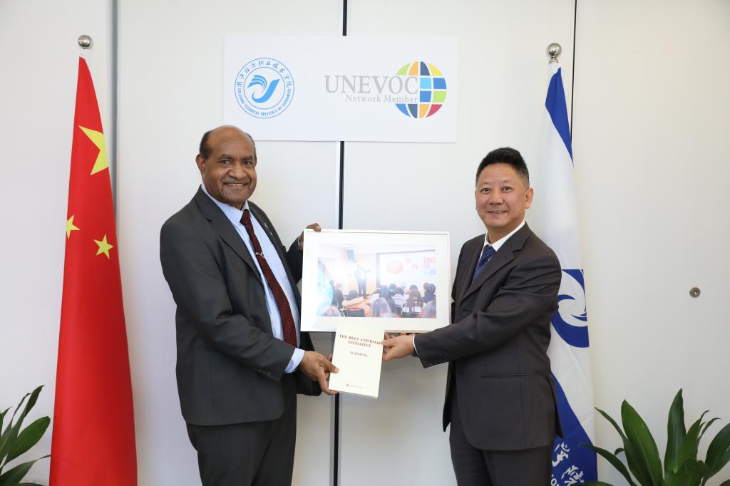 同学们对专家在讲座中提到的话题非常感兴趣,讲座结束后, Robert Parua先生跟同学们进行了深入的互动交流。郑刚强教授将Robert Parua先生2019年来校讲座的照片和英文版《习近平谈“一带一路”》一书一起赠予其留念。
