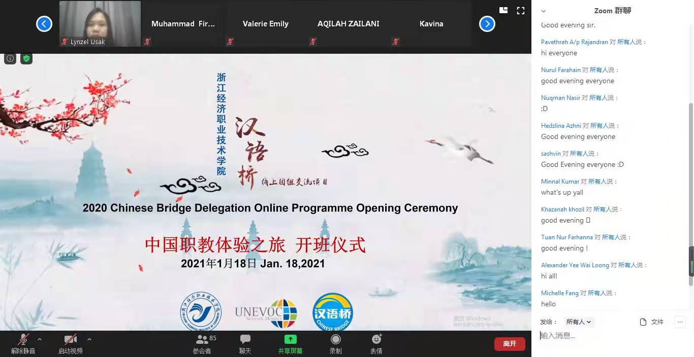 2021年1月18日,由教育部中外语言交流合作中心主办、我校首次承办的以“中国职教体验之旅”为主题的2020年“汉语桥”线上团组项目启动开班,来自马来西亚、加拿大和摩洛哥的149名学员参加学习,开班仪式上,我校外事办、国际教育中心主任郑刚强教授向各国学员表示欢迎并简要介绍了我校的办学历史和办学特色,同时也邀请他们在疫情过后亲身来体验中国的职教之魅力。