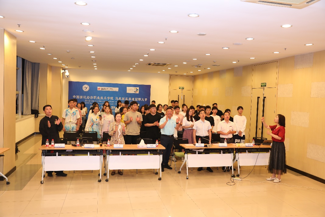 本次联谊会的压轴戏码是我校在场的师生通过视频的方式现场向马来西亚学生教唱传统歌曲《茉莉花》,双方的距离伴随着悠扬的歌声不断被拉近。“山川异域,日月同天”,我校师生也为正在经历新一轮封城措施的马来西亚师生送上了祝福,祝福他们保重身体,并相约在疫情过去之后,一定要面对面再次相聚。联谊会在双方共唱《甜蜜蜜》的甜蜜友好氛围中落下帷幕。