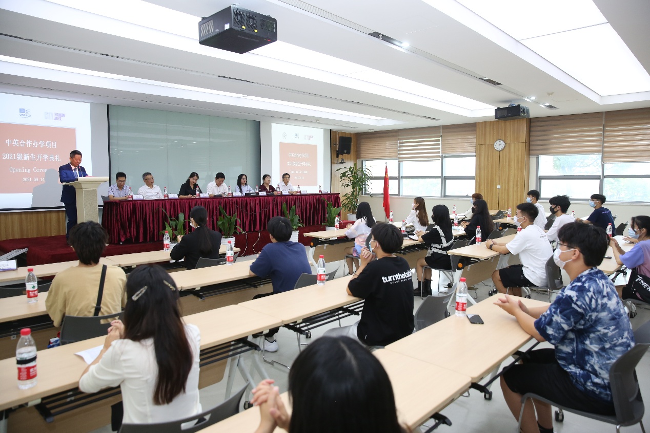 在下午举办的2021级中英合作班开学典礼上,校党委委员、副校长黄春麟,教务处处长潘凤钗,学生处处长柳虹、物流与供应链学院党总支书记张妮佳、物流与供应链学院院长王自勤、物流与供应链学院副院长郭星明、周建荣和马荣飞出席了典礼。开学典礼由外事办主任郑刚强主持,物流与供应链学院部分任课老师和全体新生班同学一同参加了本次开学典礼。英方合作校,格拉斯哥城市学院校长Paul先生通过视频向新一届同学们表达祝贺和期许,并祝愿两校的合作随着同学们的加入共创更辉煌的明天。