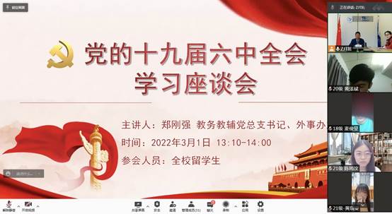 为深入学习贯彻党的十九届六中全会精神,深化我校留学生对中国共产党发展历程与历史经验的认知,引导留学生了解更加真实的中国,3月1日下午,我校举办留学生学习党的十九届六中全会精神座谈会。外事办全体成员参加,全校30位学历留学生全体线上参会学习。