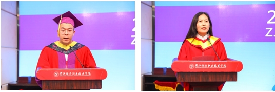 随后,毕业生代表吴浩楠同学和教师代表董珊珊老师分别发言。吴浩楠用流利的英语发言,感恩母校对自己的培养。董珊珊老师希望同学们今后继续努力前行,开启美好新征程。