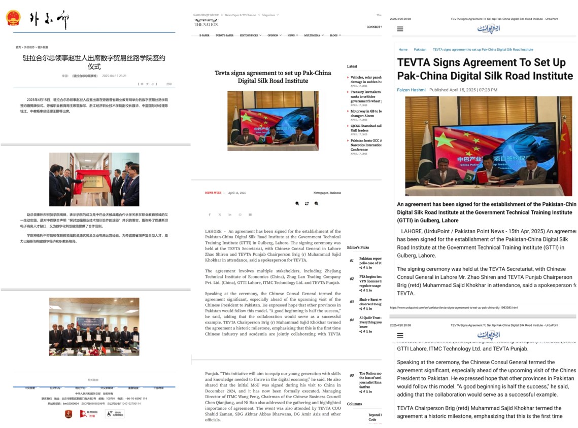 中巴数字贸易丝路学院的签约与成立等相关事宜,受到中巴多方关注,被中国外交部网站、巴基斯坦《民族报》《卧尔都报》等报道。
