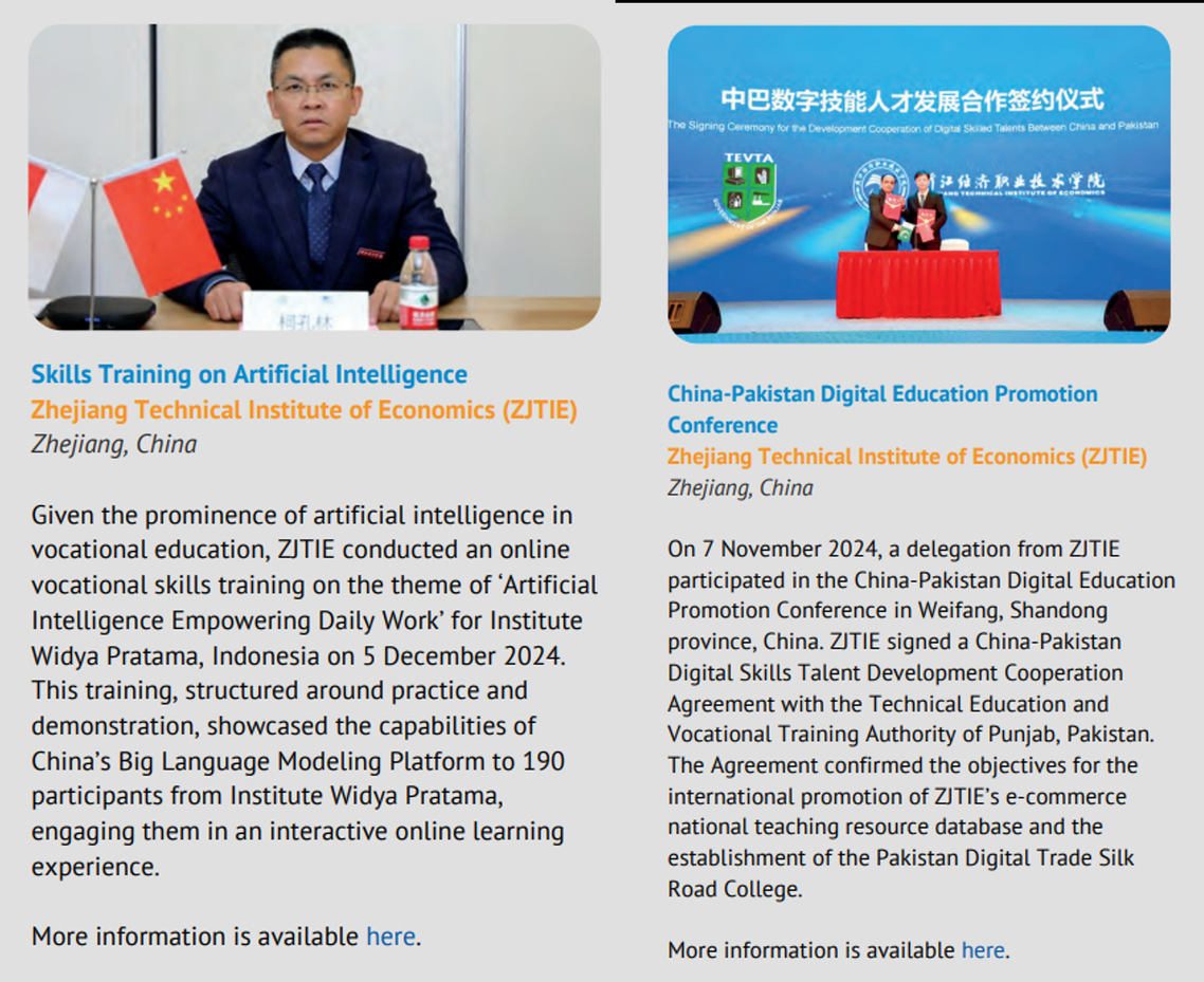 联合国教科文组织国际职业技术教育与培训中心(UNESCO-UNEVOC)6月4日最新发布的《UNEVOC Network Spotlight》(联合国教科文组织国际职业技术教育与培训网络聚焦)期刊,重点刊载了我校两项国际合作项目:一是与巴基斯坦旁遮普省职教局签署中巴数字技能人才发展合作协议;二是为印度尼西亚维迪亚普拉塔玛学院开展人工智能技能培训。这两个项目作为2024年联合国教科文组织国际职业技术教育与培训网络典型项目,向全球245个国际职教与培训联系中心推介,展示了学校国际化办学成果,提升了学校的国际知名度。