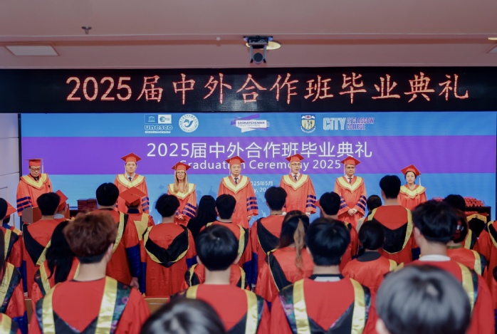 5月27日下午,2025届中加合作金融管理专业、中英合作现代物流管理专业毕业典礼在我校崇学楼三楼报告厅举行。加拿大萨斯喀彻温理工学院校长Larry Rosia,我校副校长聂华、党委委员叶林良,英国格拉斯哥城市学院代理副校长Carla Gethin、外事办、数字财经学院、智慧物流学院主要领导、中外教师代表及全体合作班级毕业生参加了毕业典礼。典礼由外事办副主任康春晓主持。