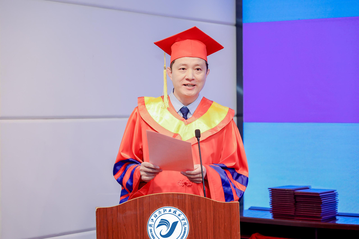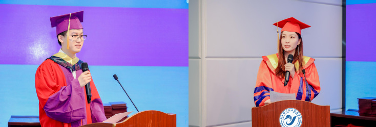 毕业生代表王一展和教师代表吴雯婷在典礼上发言。王一展同学代表全体毕业生感谢母校的培养,未来将铭记师生情、母校情,不断进取,为国家建设贡献力量。吴雯婷老师勉励毕业生不断努力,在未来的职业生涯中永葆求知热情和创新精神,成为具备国际视野和实践能力的复合型人才。